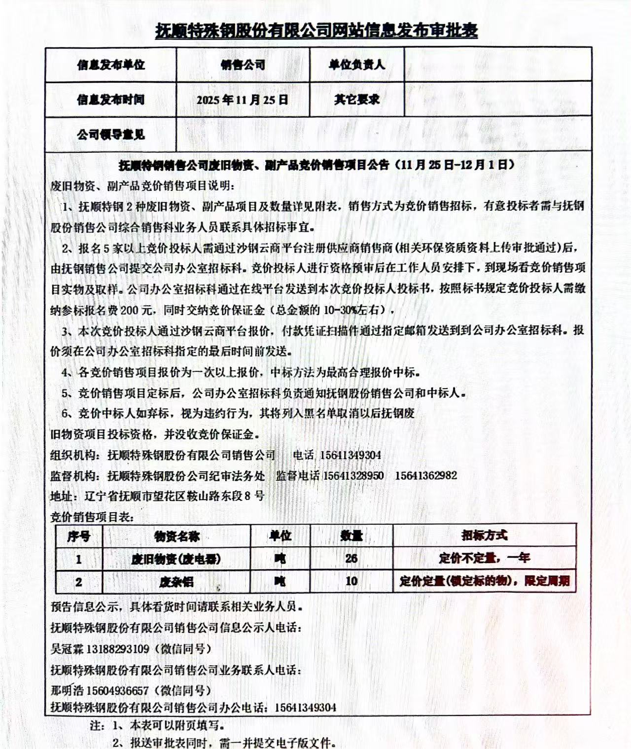 撫順特鋼銷售公司廢舊物資、副產(chǎn)品競價銷售項(xiàng)目公告(11月25日-12月1日)