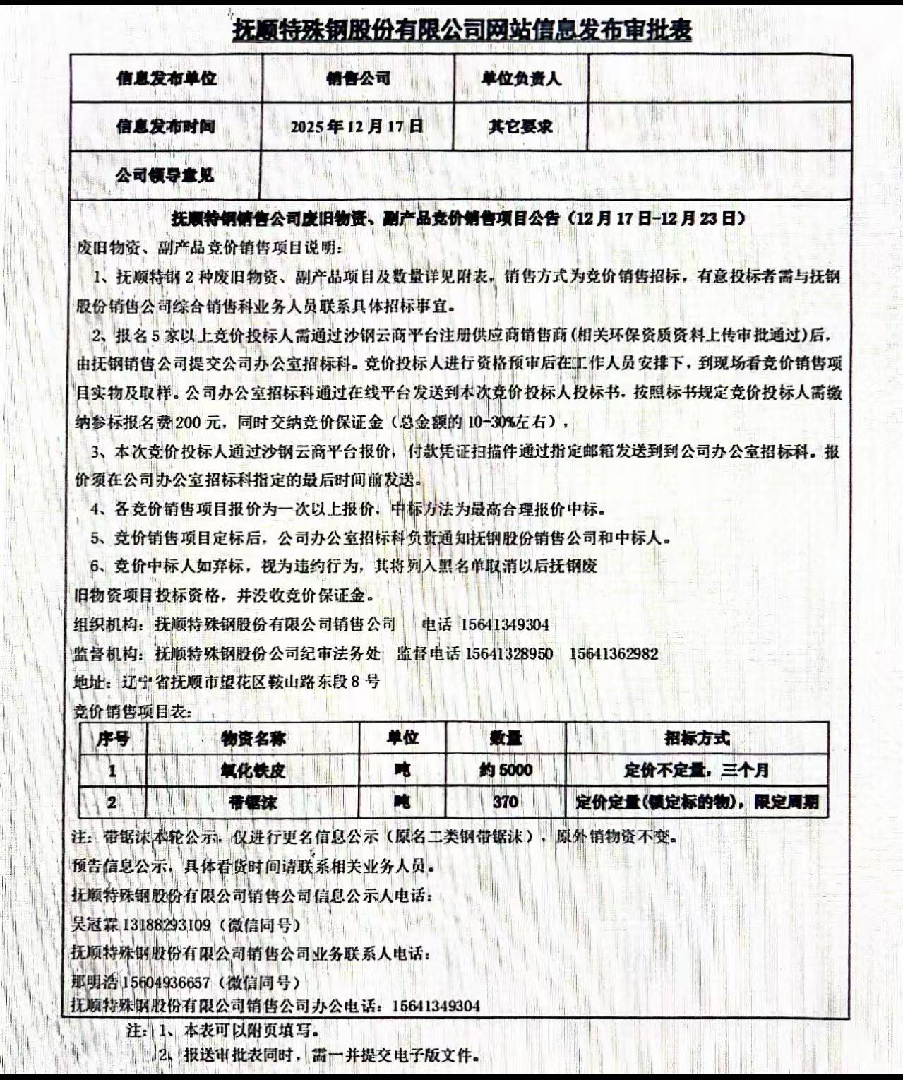 撫順特鋼銷售公司廢舊物資、副產(chǎn)品競價(jià)銷售項(xiàng)目公告(12月17日-12月23日)